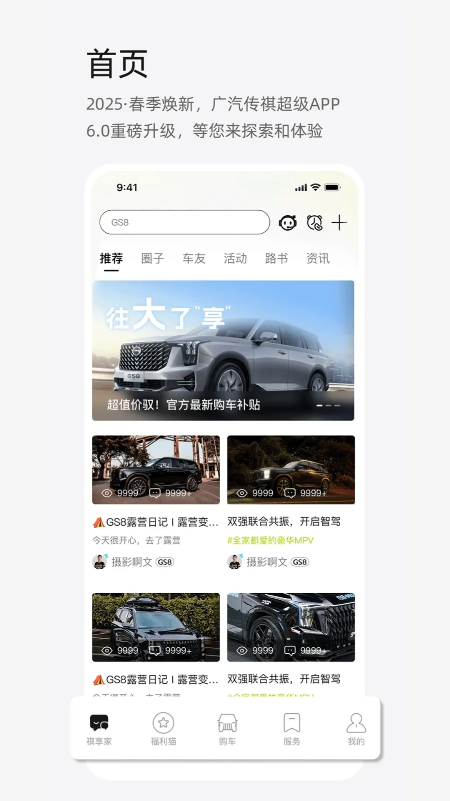 1. 板块焕新:重新定义祺享家、福利猫、购车服务和我的五大频道,呈现更清晰更聚焦的车生活服务。