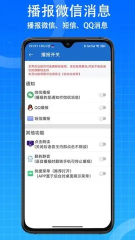 语音王APP是一款超实用的语音软件。它能为用户播报微信、QQ、短信消息,还有整点报时等,让用户轻松知晓各类信息。来电报号功能方便快捷,来电时自动播报号码或姓名。其读屏功能对视力弱的用户十分友好,可滚动读屏。充电提醒能实时告知电量状态。界面简洁,操作简单,功能齐全,无论是消息播报、报时,还是语音计算等,都给用户带来极大便利,全方位满足了不同人群的需求,是一款不可多得的语音工具。