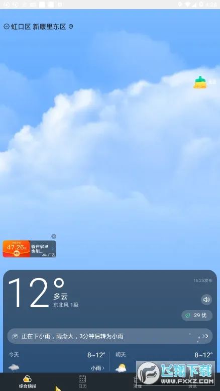 想知道精准的时刻天气预报,几点几分下雨?时刻天气app就能满足你!它是一款超棒的智能综合天气预报服务软件。数据来自权威机构,能提供精准的24小时天气预报和未来15天预报,全国各城市区域都覆盖。有及时的异常天气预警,能提早防范灾害。还有贴心生活助手,多方面生活指数和空气质量指标数据,穿衣、出行、带伞等都有提醒。它能精准到分钟级预报雨雪变化,未来2小时的雨雪情况也能提前知晓。不仅如此,还有丰富日历查询功能,以及便捷清理工具。另外,它还有动态背景,跟随天气变化日夜交替显示。有了它,你就能随时掌握身边天气,合理安排出行计划,让生活更简单方便。赶紧来下载时刻天气app吧!