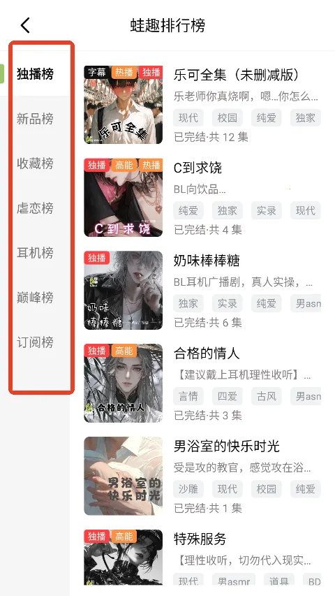 4、便捷操作:操作界面简洁直观,支持多维度搜索,剧名、CV、标签、关键字快速定位找剧无压力,还能根据分类筛选,轻松找到想听的。
