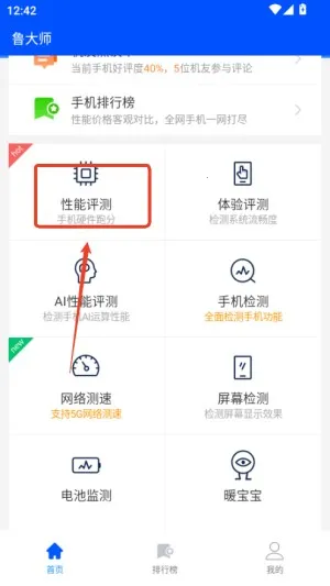 2.在主界面找到“性能评测”这类入口,点击开始测试,软件会自动给手机硬件跑分。