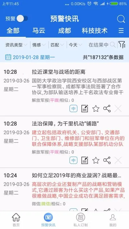 4. 可及时接收舆情信息,进行正负面信息、媒体阵营多维度分析,还能自定义监控企业集团等,监控数据实时推送并预警。