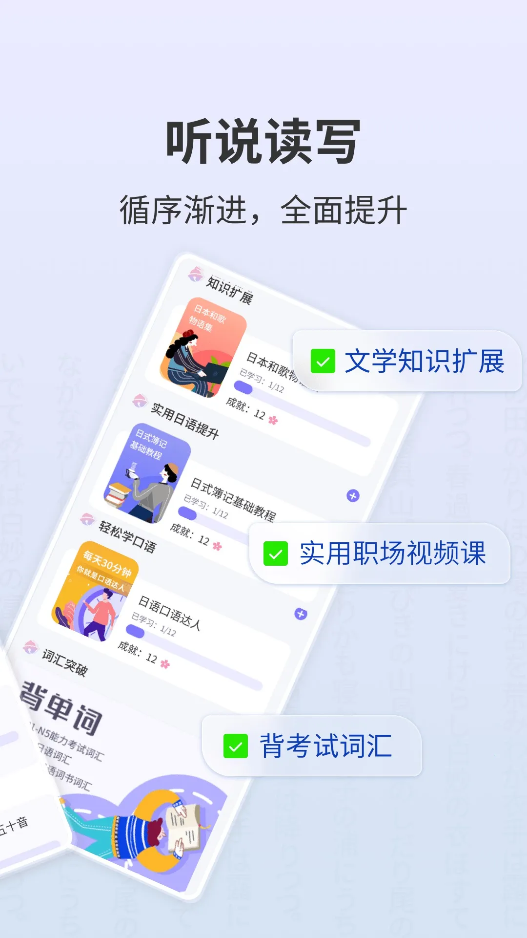 1. 系统化课程:应用内设有多个完整而系统化的课程单元,按照难易程度逐步展开教学,让用户能够循序渐进地学习日语。