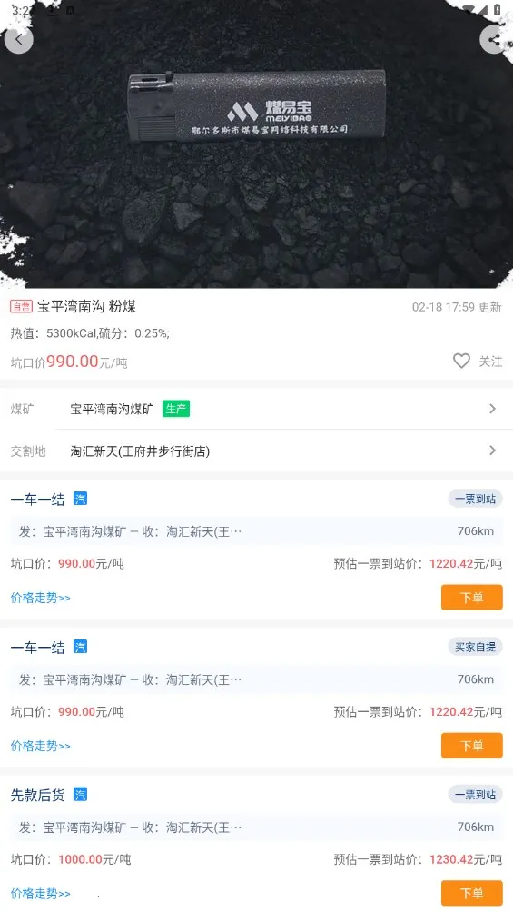 下单操作超便捷:客户在煤易宝平台按需选择煤种,一键下单,后续买煤厂矿协调煤质化验找车物流运输等都由煤易宝一站完成。