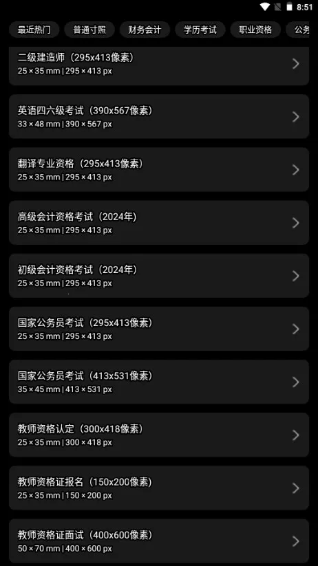 1、超全尺寸:提供超百种官方指定证件照规格,涵盖一寸、二寸、三寸、四寸等各类尺寸,以及国家司法考试、注册会计师、四六级、公务员、教师资格证等各类考试报名照,从护照到驾照,从学生证到工作证,从签证照到社保照片,一站式解决证件照问题。