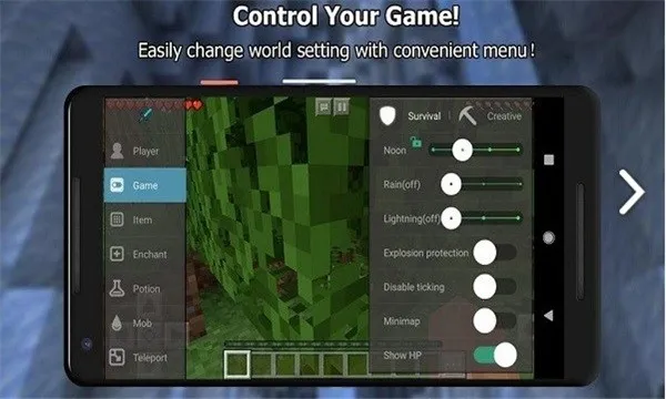 3. 属性修改超精细:可自定义玩家血量上限、饱食度、药水效果时长,甚至设定生物血量与生成规则。附魔功能突破等级限制,草方块也能附上锋利V。参数滑块式调节,无需输入指令,降低使用门槛。