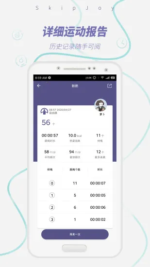 1. 模式多样:提供计数跳、计时跳、自由跳三种模式,能满足不同训练需求,无论是日常锻炼、体能测试还是考试备考,都能灵活适配个人训练计划。