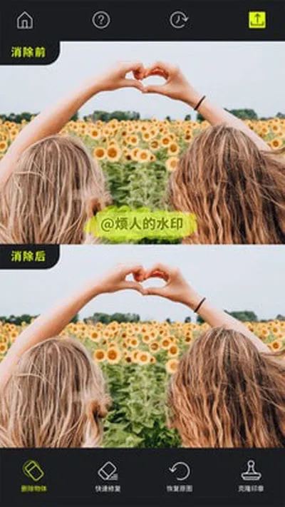 3. 效果出色:高级擦除效果很棒,能完美删除水印;快速修复可一键消除杂物,还原照片原本样子。