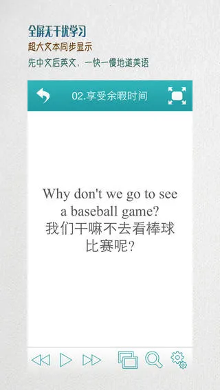 2. 独特学习模式:超大文本同步显示,先中文后英文,一快一慢地道美语,无干扰学习;支持按课程、自选列表收听,可筛选短句,还有多种播放方式和语速设置。