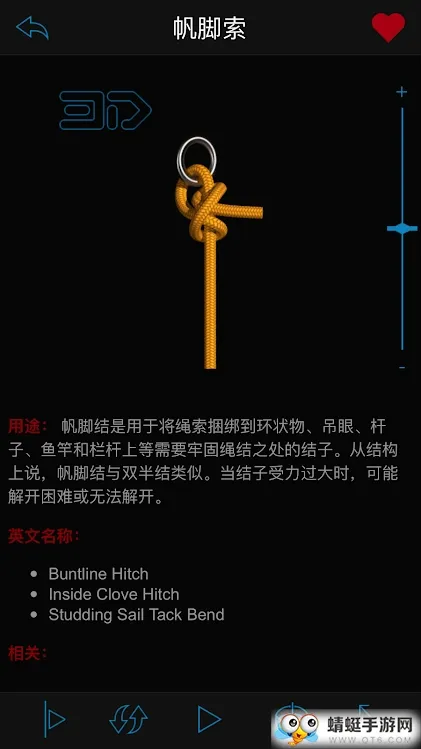 2. 3D动图教学:每个绳结打法都提供3D动图,可360度全方位学习,还能变速观看,让学习打绳结技巧变得更加直观、简单。