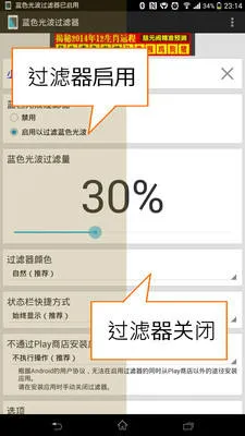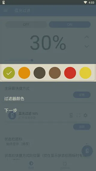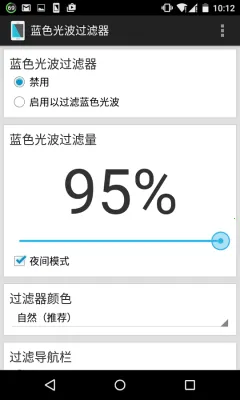 3. 快捷操作便利:状态栏常驻悬浮控制条,支持亮度与过滤强度快速调节。通知栏添加开关按钮,无需进入主界面即可切换状态。支持开机自启动功能,拖动滑块即可生效。