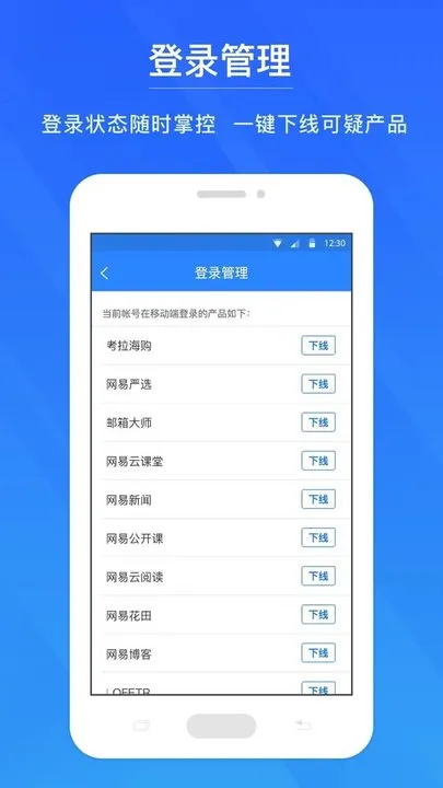2. 登录管理超及时:借助APP,可及时掌握手机端已登录的网易产品,还能随时让可疑设备下线,保障账号安全。