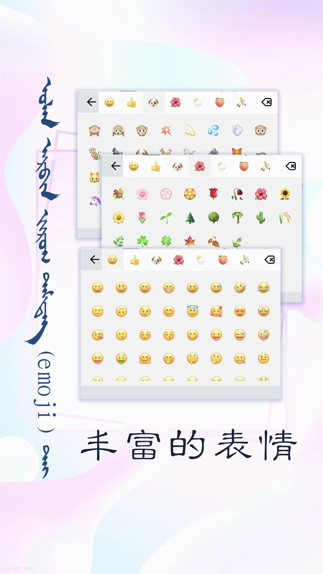 1. 多种输入方式:支持标准的26子母件输入、蒙文查干陶勒盖键输入、数字输入以及绘文字输入等,满足不同用户输入习惯。