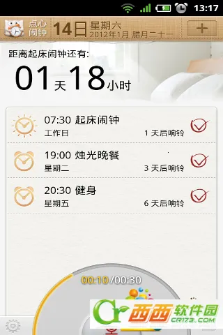 如果你想找点心闹钟 app 的铃声,那这款软件就很合适。点心闹钟 app 能满足你对闹钟铃声的多样需求。它是安卓平台上超实用的闹钟软件,可自定义各种起床闹钟。要是你爱懒床,还能自定义响铃持续时间和间隔。其功能超全面,支持自定义所有工作日闹钟,有倒计时设置、录音备忘、贪睡功能等。比如设置工作日,不管是周一到周五、大小周还是轮班倒,都能准确响铃,帮你合理规划作息。节假日智能提示,补休上班不怕迟到,假期也不会被吵醒。还有入睡时间提醒,让你适时休息。任意日期能响铃一次,方便规划行程。录音备忘可记录重要事情,起床后聆听。快捷添加闹钟,随手拖动就行。贪睡功能很贴心,翻转手机就能多睡会儿。有了它,能轻松解决闹钟铃声及相关设置问题,让生活更规律便捷。
