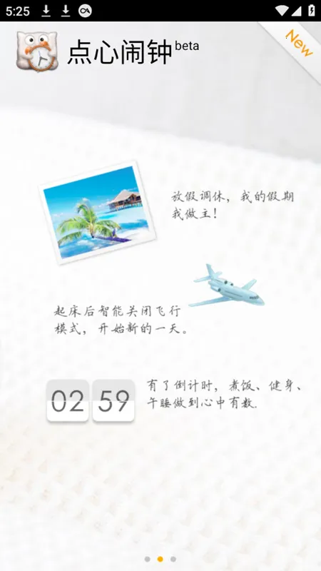 点心闹钟安卓版是一款实用的手机闹钟软件。可自定义起床闹钟,设置响铃时长等。功能全面,支持自定义工作日闹钟、倒计时、录音备忘、贪睡等。便捷添加,适配多机型,闹铃人性化,让生活更规律。