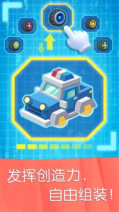支持儿童创意DIY,可自由搭配轮胎、贴纸等汽车配件,组装24款车型,还能参与儿童创意玩法,如抓捕抢劫犯、维护城市交通秩序等,培养洞察力和逻辑思维能力。