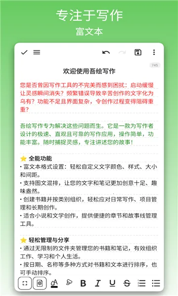 1. 富文本格式设置超便捷,能轻松自定义文字颜色、样式、大小和间距,支持图文混排,让创作更具创意。