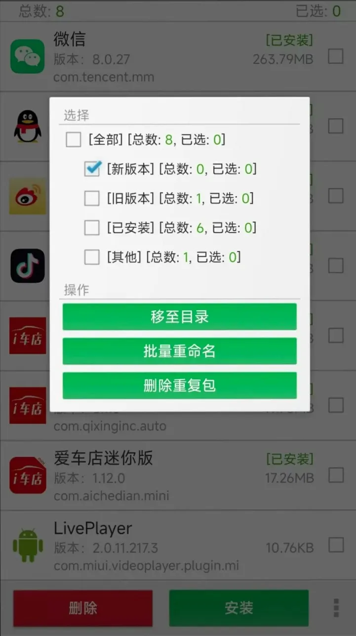 2. 具备一键重命名、删除重复包、目录迁移等功能,无论是备份应用、旧机转移软件还是清理空间,都能轻松应对。