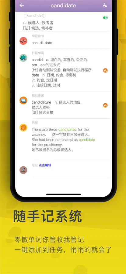 便捷功能体验好:支持边背单词边做笔记,有强大的整理收集查询系统;可一键收藏重点信息;能随时呼叫贴心管家解决问题;还有随手记系统,方便收纳零散单词。