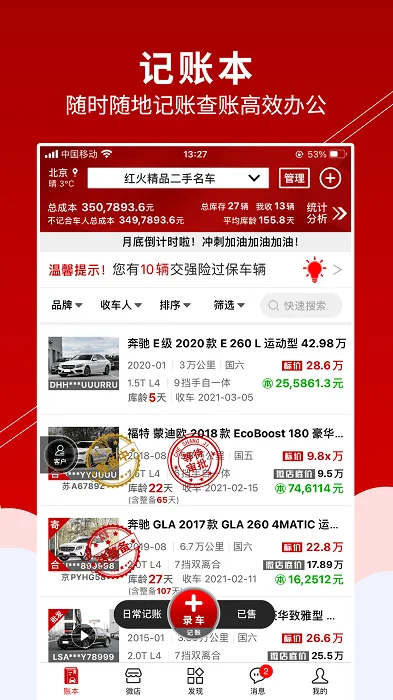 3. 操作便捷:手机记账方便,每笔销售记录能永久保存。进入账本即可快速记账、录车,还能在平台搜索所需信息。比如记账时打开app进入左下角账本选记账点击记一笔,填完内容保存就行;录车则在三大类里选库存点击录车,填完信息保存。