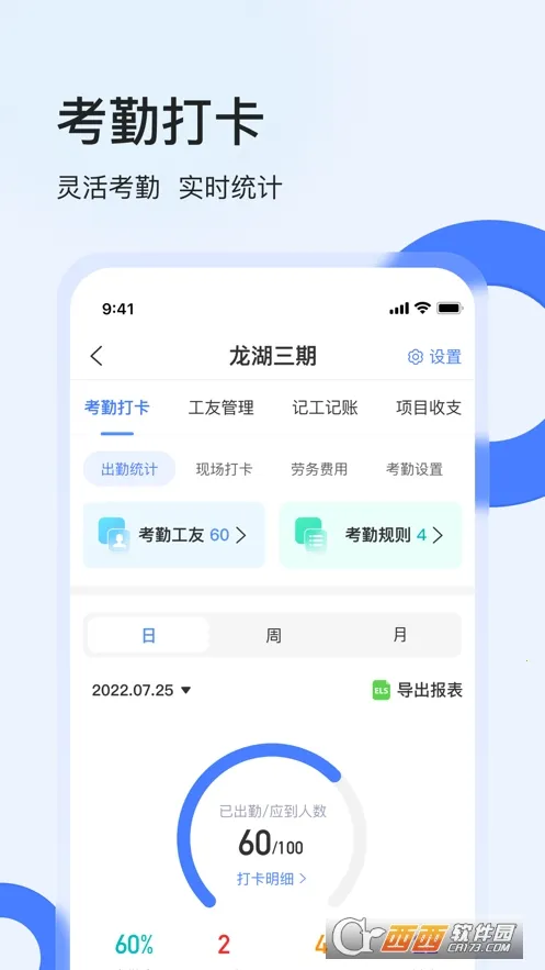 支持项目分组管理,可按工地、班组、工种等多层级架构设置,灵活适配各类工程项目需求。