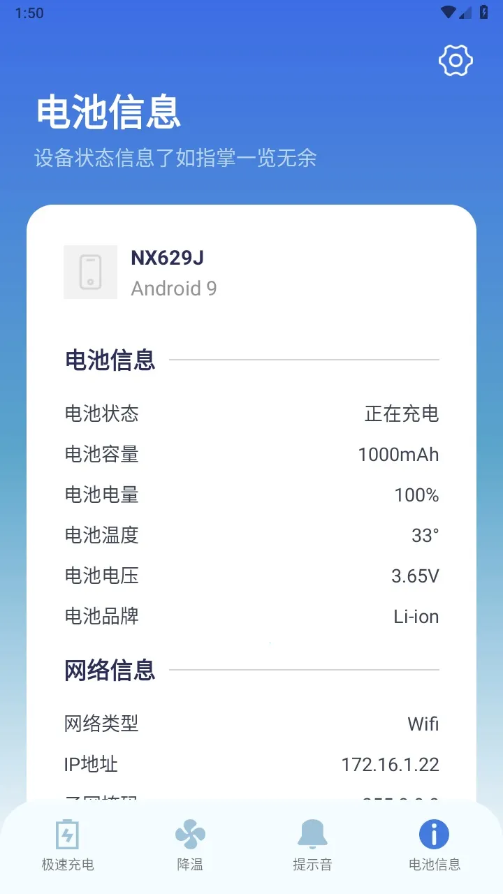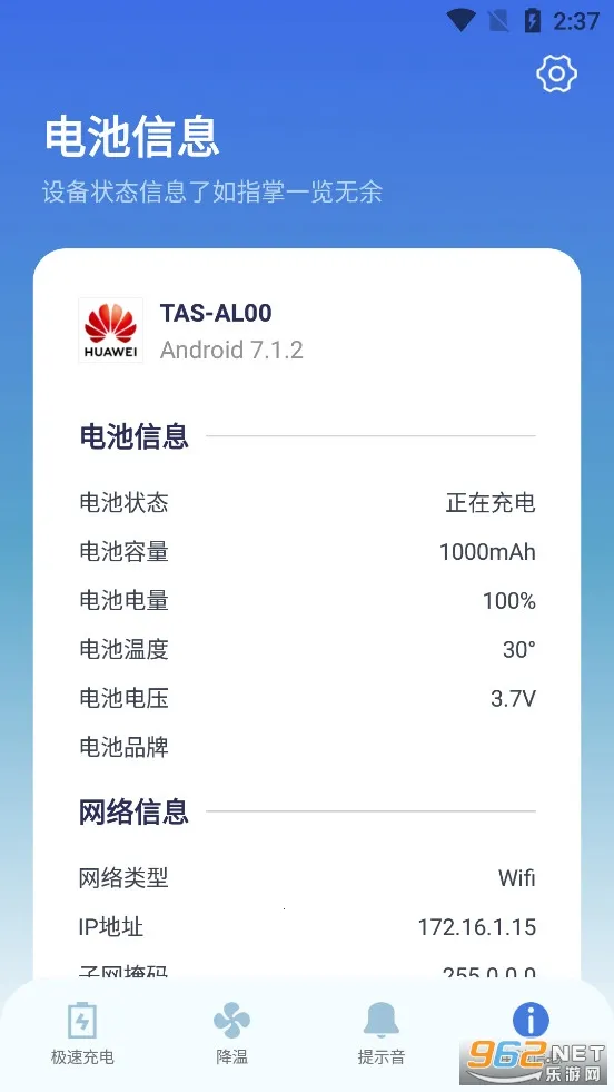电池信息状态详尽:提供电量、充电电压、温度等多项电池数据,帮助用户了解设备运行状态,当电池温度过高时会发出警告,守护电池健康。