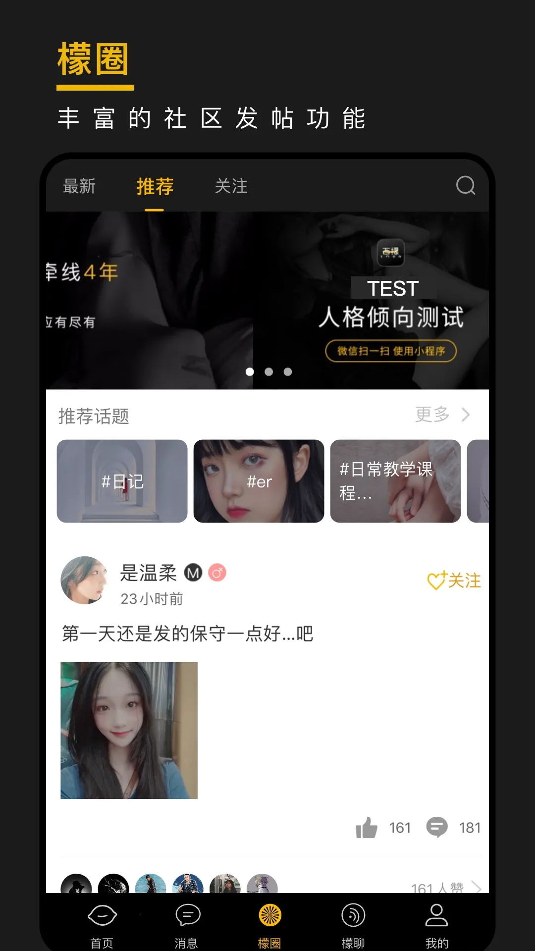 西檬之家提供丰富多样的兴趣社群,涵盖摄影、旅行、健身、音乐、电影等多个领域,满足不同用户的兴趣需求,让用户能轻松找到志趣相投的人深入交流分享。