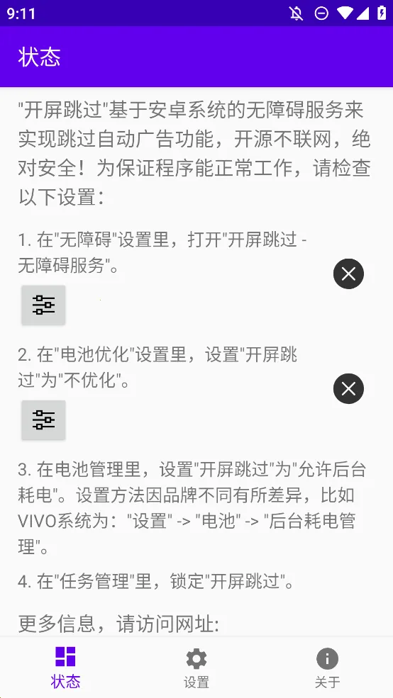 开屏跳过安卓版是一款实用的手机广告屏蔽软件,能快速拦截各类烦人的广告弹窗,节省流量与内存。操作简单,界面简洁,兼容性强,可自定义设置拦截词等,还能通过多种方式跳过开屏广告,给你干净流畅的上网体验。