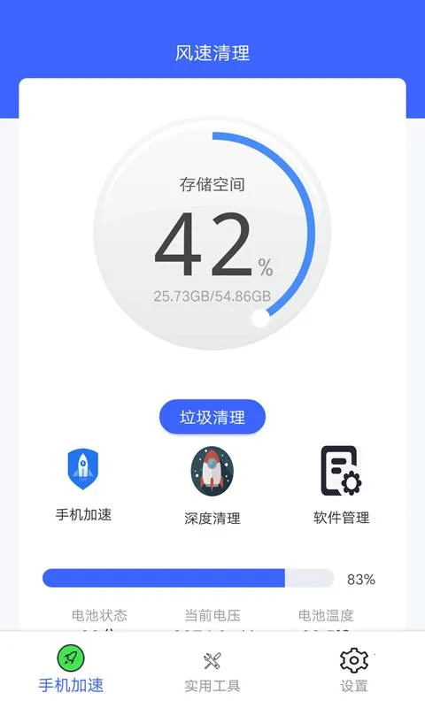 风速清理大师2025官方最新版本是一款实用的手机优化工具,集垃圾清理、内存加速、电池管理于一体。能一键释放存储空间,智能监测设备状态,解决卡顿发热耗电等问题,操作简单,界面简洁,让手机运行更流畅。