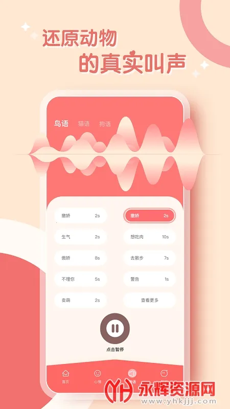 2. 内置丰富多样的声音资源,多种类型的声音可任意挑选,如不同情绪的鸟叫、猫叫、狗叫等,还有超多动物呼唤声和叫声能随时变换操作,便于与宠物互动沟通,增进亲密度。