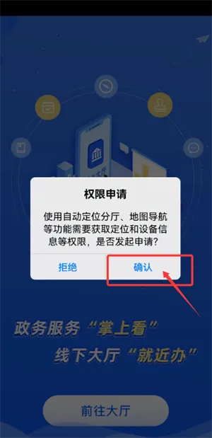 1、启动应用后,在权限申请窗口点击"允许"按钮授权定位及设备信息权限。