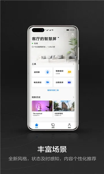 智慧屏软件能让你轻松掌控家中智能电视。它可以与电视连接,让你用操作手机的方式远程操控电视,换频道、调音量等基础操作一键搞定,完美替代实体遥控器,触控超流畅。有了它,你能随时随地给家里的智慧屏发送留言,传递关爱。还能远程帮家人完成点播和设置等操作,实现协助与关怀。而且支持高清畅连通话,即便距离远,和家人沟通也近在咫尺。不管是华为旗下还是其他品牌的智能电视,通过蓝牙、wifi等方式就能连接。手机端下载安装软件,注册或登录华为帐号后,简单几步就能添加智慧屏并操控。它操作方便,提供良好互动体验,让看电视更轻松,满足你对智能电视便捷操控的各种需求,快来试试吧!