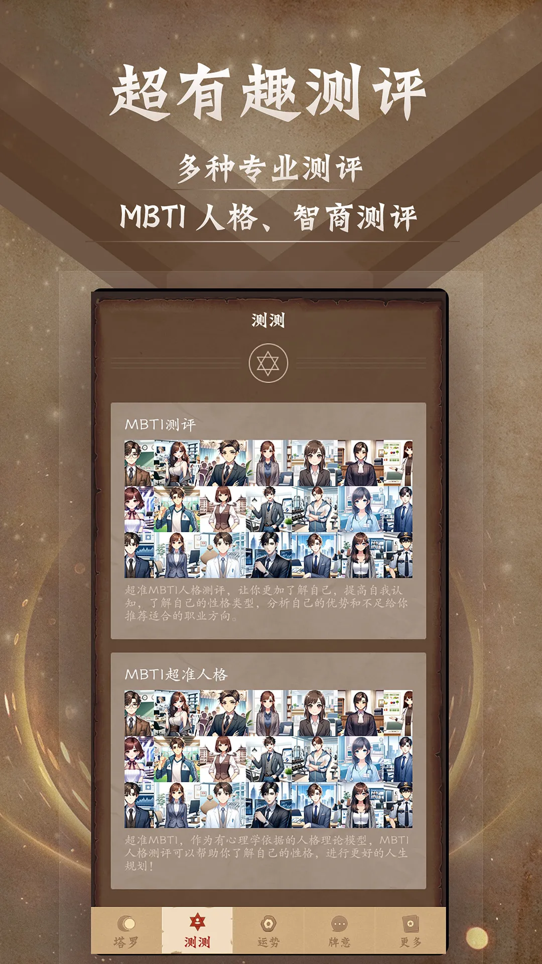 1. 全面性格探索:结合MBTI与塔罗牌,带来占卜与心理测评双重体验,助您全方位了解自己。