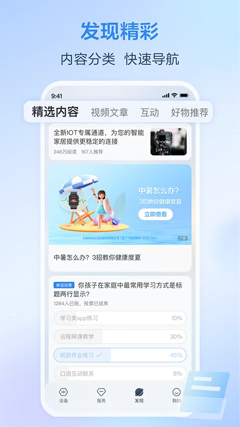 1. 它以家庭为中心,融合连接管理、亲情沟通、家居服务、家庭权益等多样场景,是家庭生活的智慧助手与家庭业务统一入口,为用户打造新型智慧家庭生活方式。