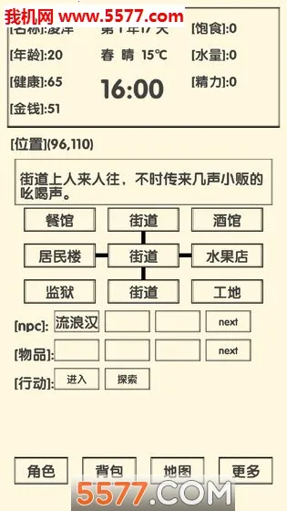 《流浪人生2命运》是一款超有趣的文字冒险游戏。它用文字构建出开放世界,让失忆主角面临各种生存抉择。你可以选择隐姓埋名街头流浪,也能追踪线索揭开身份谜团。游戏模拟了完整的季节更替,不同气候会影响角色状态和可去场景。在资源管理、人际交往与技能培养这三个维度维持角色生存值,才能继续探寻未来。它有着200*200的大地图,走格子玩法,能自由和多种场景、NPC交互。剧情充满悬念,围绕失忆探寻真相。还有季节天气系统,一年四季温度随机变,天气也随机,要注意健康值。而且健康值为0时不会死亡,不存在删档烦恼。这里能体验不同生活,找到隐藏秘密,感受乐趣,快来开启这场独特的流浪人生吧!