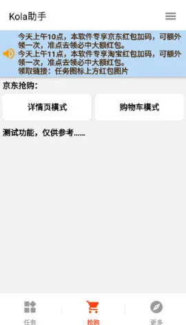 Kola助手是电商抢购辅助工具,内置多种抢购脚本,支持预设参数自动抢购。整合优惠活动与福利信息,操作便捷。能自动完成淘宝京东等平台多种任务,提升购物体验,绿色免费无广告干扰。