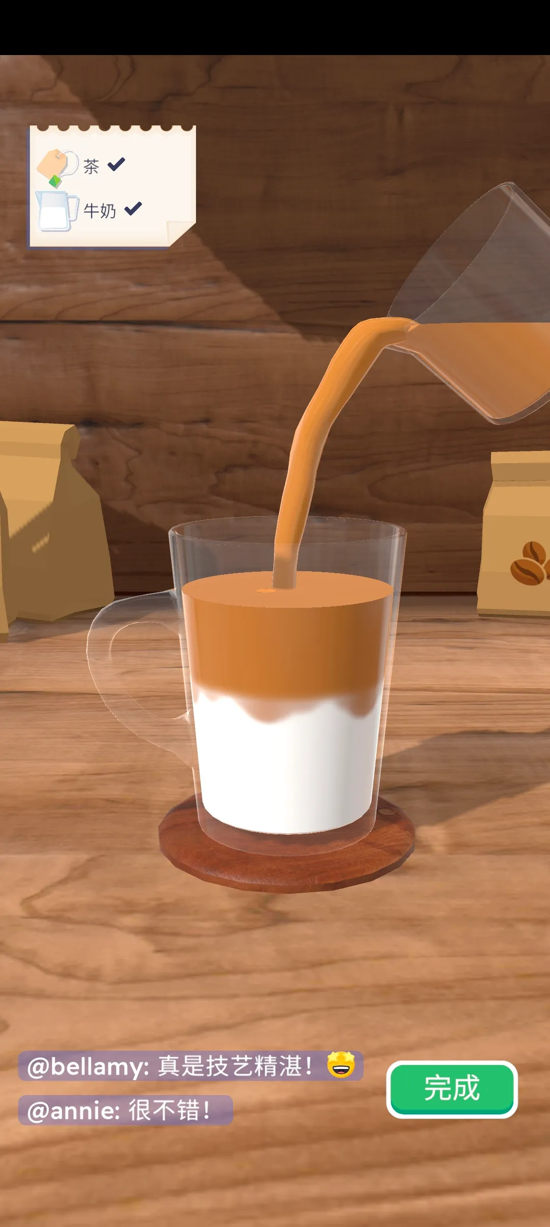 3. 高度拟真制作过程:涵盖倒液、混合、搅拌、装杯等多步骤,沉浸式体验咖啡师日常。