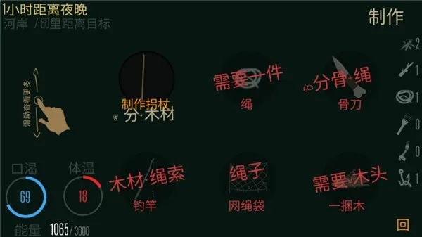 1. 围绕生存展开,工具联动。游戏目标纯粹是生存,工具间存在联动关系,需合理组合使用,例如户外用刀生火,绳索手链做陷阱等。