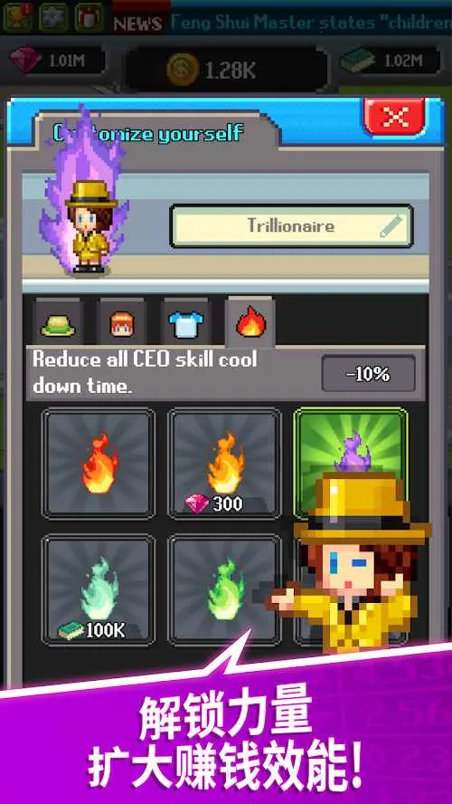 点点亿万富翁是一款超有趣的模拟经营游戏。它有着经典像素画风,玩法轻松易上手。玩家出任公司CEO,点击屏幕积累资金,招募人才扩充业务。可通过低买高卖商品、股票投资来赚钱,还能升级办公环境。雇佣员工要注重投资成功率,合理利用技能和点击buff。有丰富的经纪人可供选择,其专属技能各有特色。在这里,能真切体验从白手起家到成为亿万富翁的全过程,享受经营乐趣,值得一玩。
