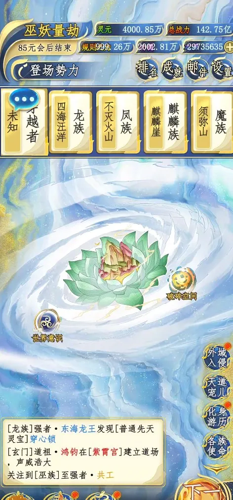 3、特色角色养成:游戏中有天道主宰、洪荒大能、族群领袖等多种角色。玩家可通过培养这些角色,组建战力梯队守护洪荒安宁,如鸿钧老祖引导悟道,三清作为族群靠山,十二祖巫抵御外敌。