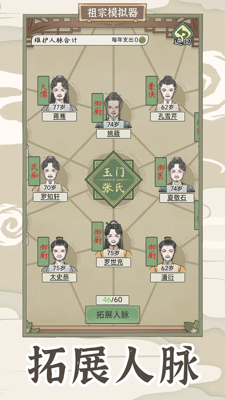 祖宗模拟器是一款家族经营模拟游戏。玩家以首代老祖身份掌管家族,古风背景与丰富文字叙述带来沉浸式体验。要处理成员关系、应对随机事件,合理安排产业、培育子嗣,慎重抉择族长传承,掌控家族兴衰。