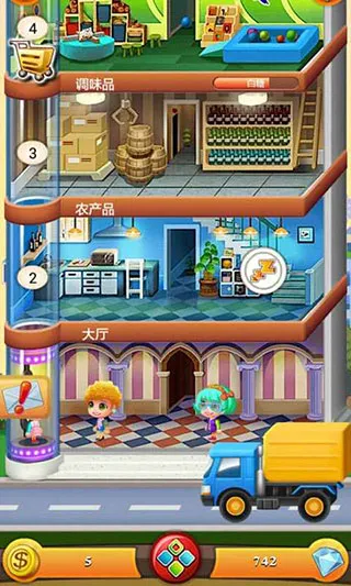 1. 独特画面风格:采用竖版2D画面表现形式,以卡通元素制作,包括人物、背景、装饰品等,大头娃娃造型人物充满喜感。塔形楼层为背景,不同风格装修代表不同制作商店,方便寻找选择。